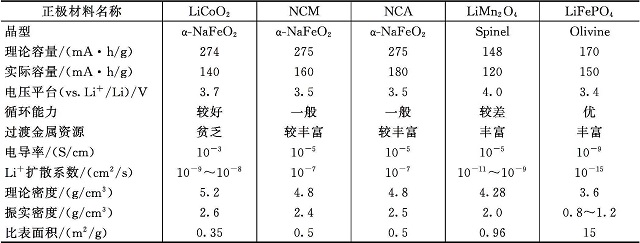 表1-1 鋰離子電池正極材料的比較