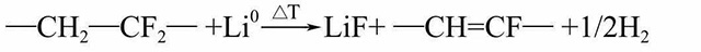 在更高溫度下,負極表面失去了SEI膜的保護,嵌入負極的鋰將與電解液溶劑直接反應(yīng)有C2H4O產(chǎn)生,可能為乙醛或氧化乙烯。嵌入鋰的石墨在300℃以上與熔融的PVDF–HPF共聚物發(fā)生如下反應(yīng):