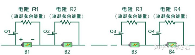 被動均衡又稱為能量耗散式均衡,工作原理是在每節(jié)電芯上并聯(lián)一個電阻。當(dāng)某個電芯已經(jīng)提前充滿,而又需要繼續(xù)給電池包充電時,接上電阻,對其進(jìn)行放電,把多余的能量耗散掉。