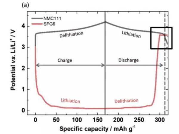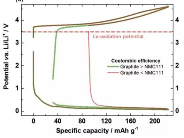 為了避免銅箔在放電的過程中發(fā)生氧化和溶解,就需要控制負(fù)極的電勢不高于3.56VvsLi+/Li。在實際的過程中,負(fù)極的電勢受到電池電壓的控制,下圖展示了當(dāng)負(fù)極的首次效率高于正極,首次效率低于正極時,在充放電過程中的電勢的變化。當(dāng)負(fù)極的首次效率高于正極時,由于正極損失的容量較多,因此在放電時雖然正極已經(jīng)完全嵌鋰,但是負(fù)極仍然保有部分鋰,因此負(fù)極的電勢較低,也就不會發(fā)生銅箔溶解的問題。但是當(dāng)負(fù)極的首次效率較低時,放電的過程中正極還沒有完全嵌鋰,此時負(fù)極的鋰已經(jīng)消耗完畢,特別是放電截止電壓又比較低時,就有可能會導(dǎo)致負(fù)極的電勢過高,導(dǎo)致銅箔的溶解。因此為了避免銅箔的溶解就需要對鋰離子電池的放電截止電壓進(jìn)行謹(jǐn)慎的選擇,避免負(fù)極的電勢過高。