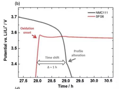 實驗中JohannesKasnatscheew等采用的電池為NMC111/石墨體系,金屬鋰作為參比電極。從下圖a中可以看到,在充電的過程中隨著Li+從正極的脫出,正極的電勢緩慢升高,負(fù)極電勢在快速下降到1V以下,在放電的過程中正好相反,Li+從負(fù)極脫出回到正極,正極電勢逐下降,當(dāng)負(fù)極完全脫鋰后,電勢迅速升高,并在3.56V左右出現(xiàn)了一個電壓平臺,下圖b為該區(qū)域的放大圖,從正負(fù)極電壓曲線上可以看到,正極電壓曲線的變化相對于負(fù)極有大約1h的延遲,隨后正極的電勢也開始快速下降,正極電勢低于負(fù)極石墨的電勢。該電壓曲線變化非常符合銅箔溶解的特點(diǎn),銅箔中的銅元素首先被氧化為Cu1+,Cu1+遷移到正極表面并在正極表面還原,沉積為金屬銅。