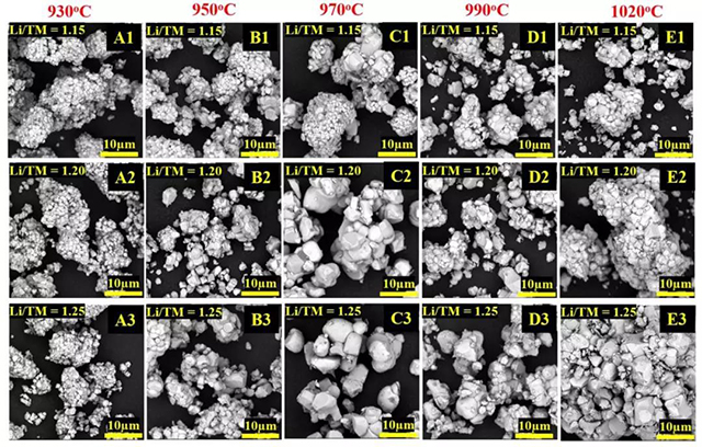 從圖中可以看出,這兩個(gè)參數(shù)對(duì)于合成單晶形貌的三元材料至關(guān)重要,過(guò)低的燒結(jié)溫度無(wú)法使一次顆粒長(zhǎng)大并相互分離形成單晶,而當(dāng)燒結(jié)溫度提高至970℃時(shí),一次顆粒的粒徑明顯增大,出現(xiàn)了幾個(gè)微米大小的顆粒,而當(dāng)溫度繼續(xù)升高至990或1020℃后,一次顆粒又團(tuán)聚在一起,無(wú)法得到單晶三元材料。在970℃的對(duì)比實(shí)驗(yàn)中可以發(fā)現(xiàn),當(dāng)Li/TM=1.15時(shí),只有很小一部分的一次顆粒長(zhǎng)大,其余的顆粒仍然較小,這可能是由于燒結(jié)溫度較高時(shí),Li損失過(guò)大,需要提高過(guò)鋰量來(lái)補(bǔ)償燒結(jié)時(shí)的Li損失。當(dāng)Li/TM提高至1.20或1.25后,一次顆粒明顯增大,并且相互間分散程度好,獲得了單晶材料。但是這種方法需要使用過(guò)多的鋰源,殘余的Li可能會(huì)導(dǎo)致材料電化學(xué)性能的下降,在燒結(jié)后需要一定的水洗工藝以去除殘余的Li。
