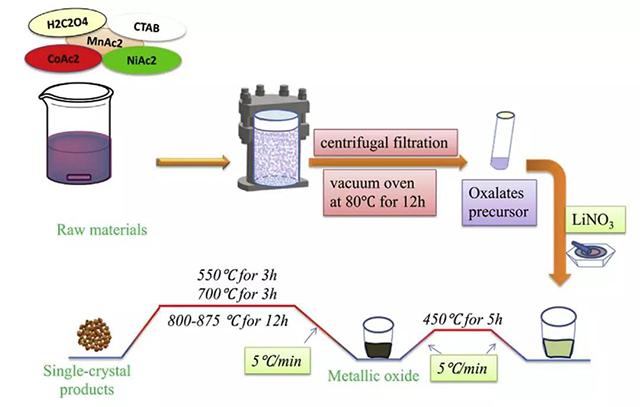 Feng Wu等(ref.6)使用水熱法制備了特殊形貌的NCM622前驅(qū)體(圖6b),然后與鋰源混合,使Li/TM=1.06,在不同溫度下燒結(jié)制備出小顆粒的單晶樣品。這種方法不用使用過(guò)量太多的鋰源,不過(guò)燒結(jié)溫度對(duì)于仍然有著十分重要的影響。