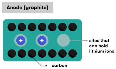 小而輕,可以在兩個電極中存儲(嵌入)很多鋰。這就是使鋰離子電池具有高能量密度的原因。例如,石墨中每六個碳原子可存儲一個鋰離子,并且有更多的鋰離子共享從陽極到陰極的行進(jìn)(在充電循環(huán)中又返回),則有更多的電子平衡它們的運動并提供電流。
